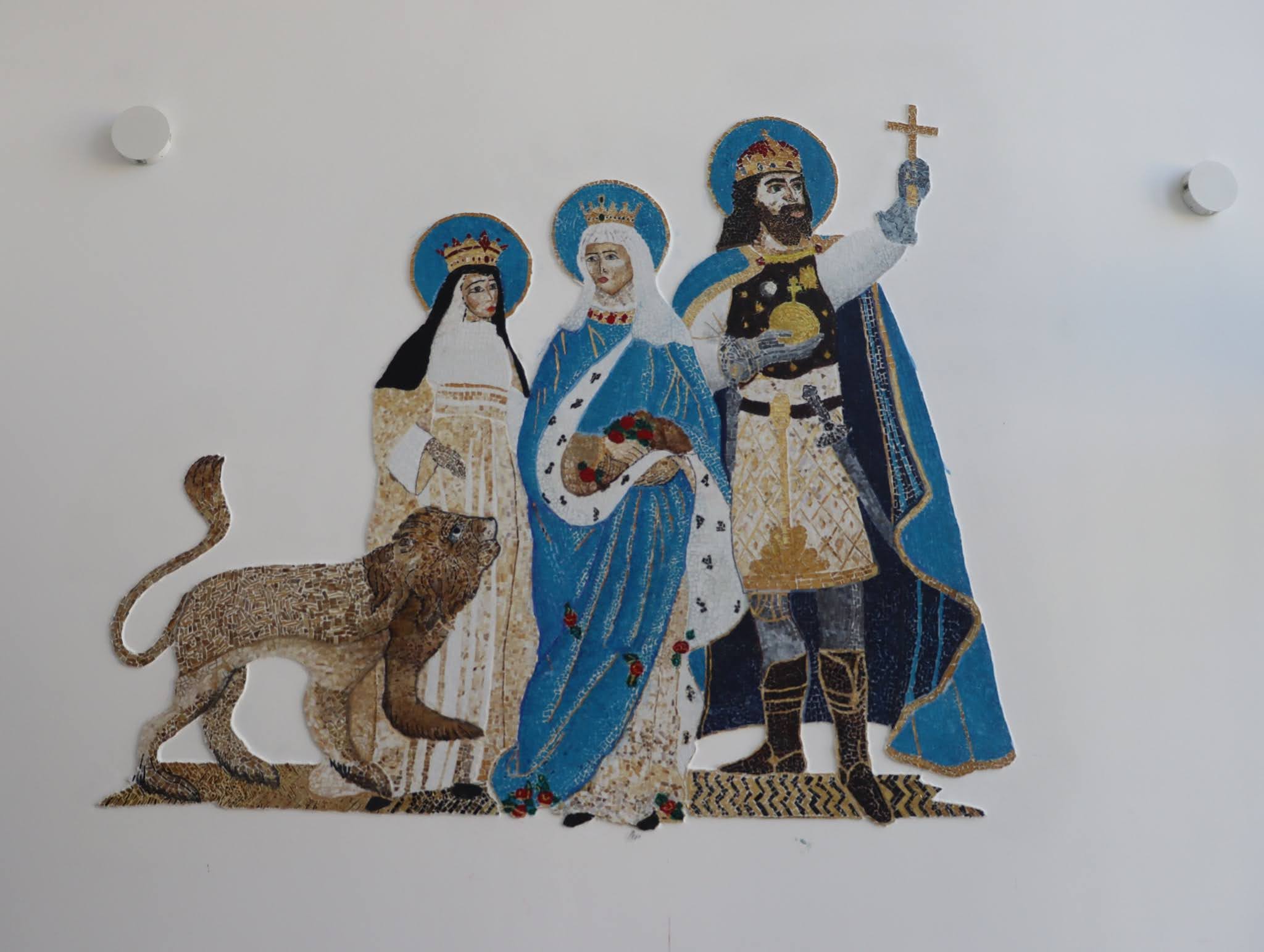 A tavalyi tanévben készült mozaik pedig november 19-én került fel végső helyére Jeanette tanárnő irányítása mellett Hajba Regina Lotti és Punger-Zay Lea 10.D, valamint Bokor Zalán és Horváth Benjamin 11. A osztály tanulók segítségével. A keleti falon található mozaik premontrei és jótékonykodó szentjei után az új mozaik a nyugati falon a magyar és premontrei kötődésű szenteket ábrázolja: az oltárhoz legközelebb áll Szent László király, aki Szent Norbert atyánkkal is rokoni kapcsolatban állt, hiszen László dédnagyanyja volt Norbert nagyanyja. László király mellett állt Szent Erzsébet (akinek ünnepén került fel képe a kápolnába), és leánya, boldog Gertrúd premontrei apáca, az egyetlen boldoggá avatott magyar premontrei. Jó hírünk pedig az, hogy diákjaink már elkezdték ebben a tanévben egy új mozaik készítését az idősotthon kápolnája számára – ez előreláthatólag egy Krisztus-ábrázolás lesz a kápolna kórusán, hogy a kápolnába onnan érkezők számára is legyen egy olyan kép, amely Krisztus szeretetét közvetíti minden oda betérő számára.