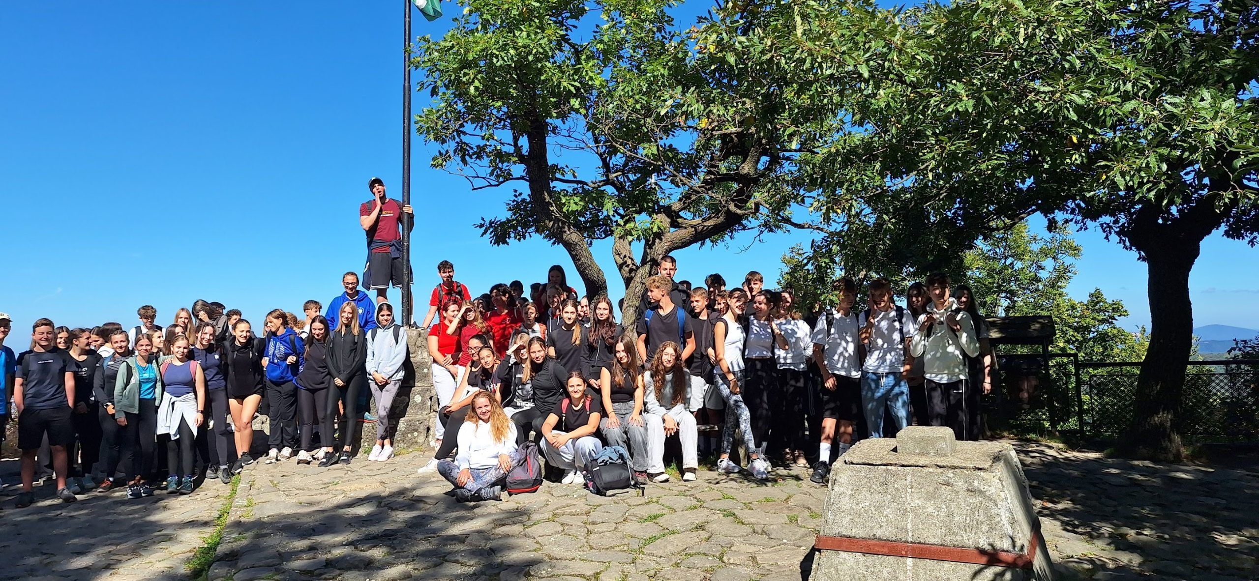 9:30 Dömös – kezdődik az ismeretlen meghódítása – a piros-fehér-zöld-kék-fekete egyenpólósok látványosságot nyújtanak a helyieknek, no meg az osztályfőnökök is könnyen átlátják a „kiscsibéiket” – fotó a túra elején a még tiszta csoportról – jó idő (már-már túl jó, erről majd a többször átcserélt pólók, az izzadt arcok tanúskodnak), erdő, tiszta levegő, egyre több emelkedő és sánc, létrával megspékelve – a premontreis diákok hősiesen emelkednek egyre feljebb és feljebb, az edzett túrázók ütemesen elöl haladva, egy-ketten lemaradnak, de a lelkes társaik megvárják őket, vannak akik szinte szökkellve mint a zergék teszik meg a távot – emberségből jelesre vizsgáznak a gyerekek – kilátó, „oh, be gyönyörű a táj” –
